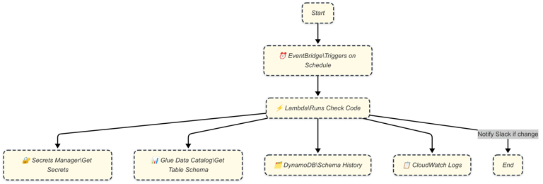 This tool, built around AWS-native services, runs as a scheduled Lambda function. It tracks schema evolution across pre-configured Glue databases and tables, comparing current schemas to historical snapshots. On detecting changes, it sends real-time alerts to communication channels like Slack or Microsoft Teams.